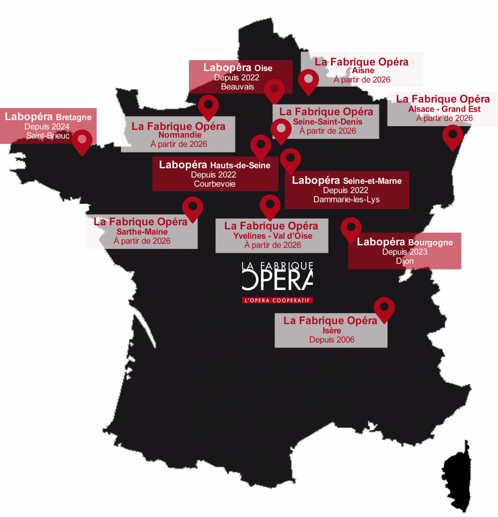 Depuis plusieurs années, La Fabrique Opéra essaime le concept d’opéra coopératif partout en France. Son objectif est de démultiplier son impact pour ouvrir l’art lyrique à un public le plus large possible en France et contribuer à la valorisation de la formation professionnelle.